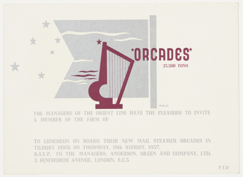 Print, Invitation for Luncheon, Orcades; Designed by Edward McKnight Kauffer (American, active England, 1890–1954); Client: Orient Line, Anderson, Green & Company Ltd.; USA; offset lithograph on paper; 13.1 × 18 cm (5 3/16 × 7 1/16 in.); Gift of Mrs. E. McKnight Kauffer; 1963-39-571