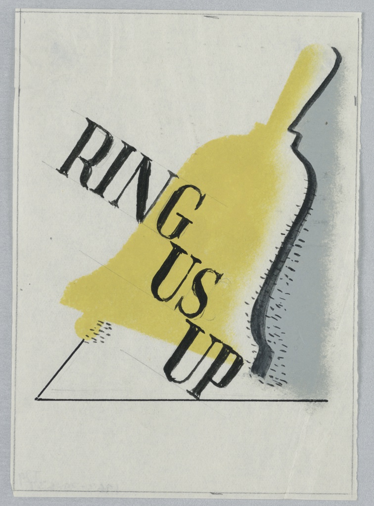 Drawing, Study for an Advertisement, Ring Us Up; Designed by Edward McKnight Kauffer (American, active England, 1890–1954); Client: British General Post Office; USA; graphite, brush and yellow, black, and gray gouache on paper; 13 × 9 cm (5 1/8 × 3 9/16 in.); Gift of Mrs. E. McKnight Kauffer; 1963-39-637