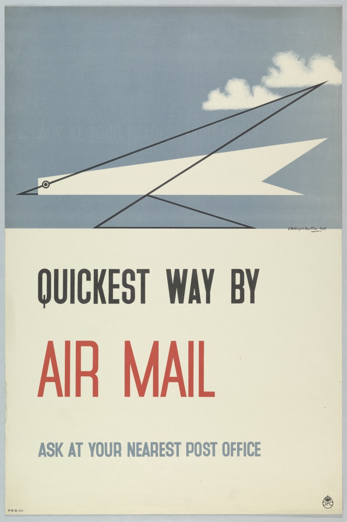 Poster, Quickest Way by Air Mail; Designed by Edward McKnight Kauffer (American, active England, 1890–1954); Client: British General Post Office; England; offset lithograph on paper, lined; 75.7 × 50.5 cm (29 13/16 × 19 7/8 in.); Gift of Mrs. E. McKnight Kauffer; 1963-39-71
