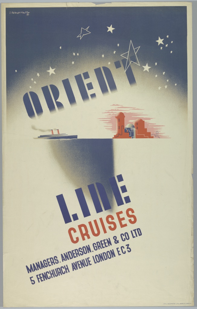 Poster, Orient Line Cruises; Designed by Edward McKnight Kauffer (American, active England, 1890–1954); Printed by John Waddington Ltd.; Client: Orient Line, Anderson, Green & Company Ltd.; USA; offset lithograph on paper; 101.6 × 63.8 cm (40 × 25 1/8 in.); Gift of Mrs. E. McKnight Kauffer; 1963-39-77