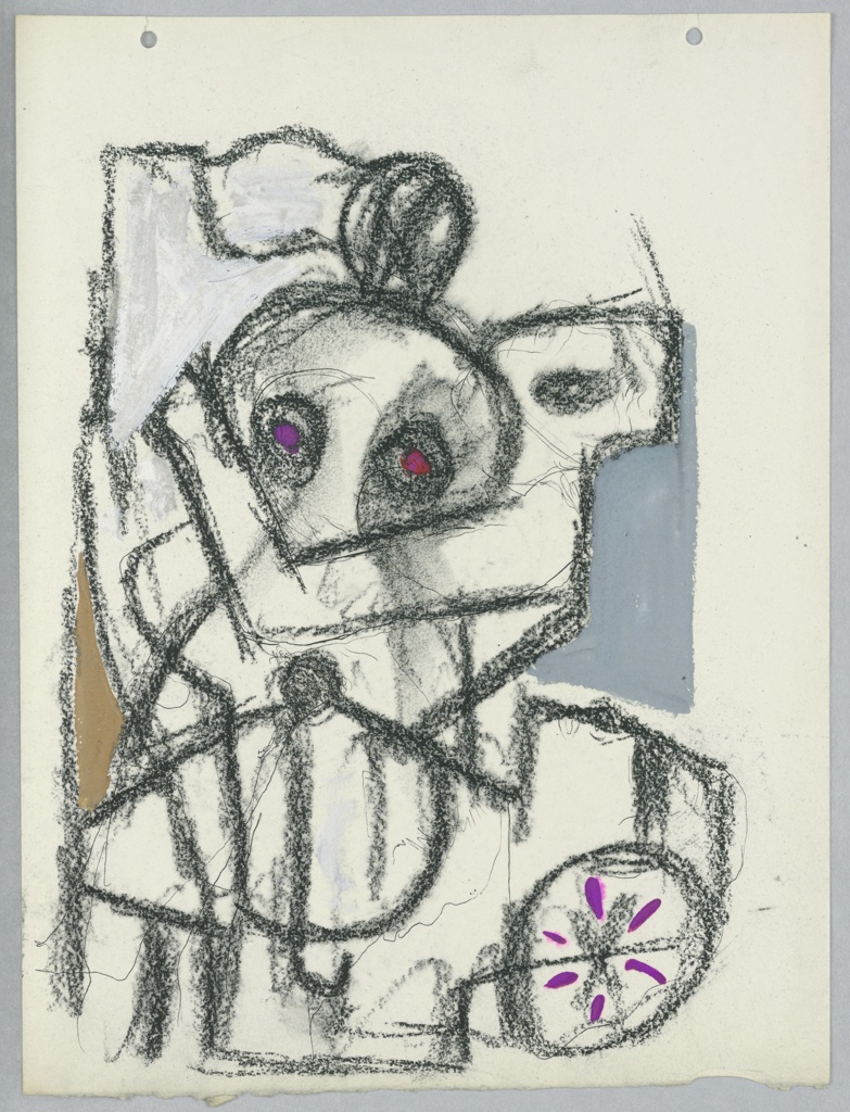 This is a Drawing. It was designed by Edward McKnight Kauffer. It is dated ca. 1948 and we acquired it in 1963. Its medium is black crayon, pen and black ink, brush and gray, brown, and purple watercolor on paper. It is a part of the Drawings, Prints, and Graphic Design department.