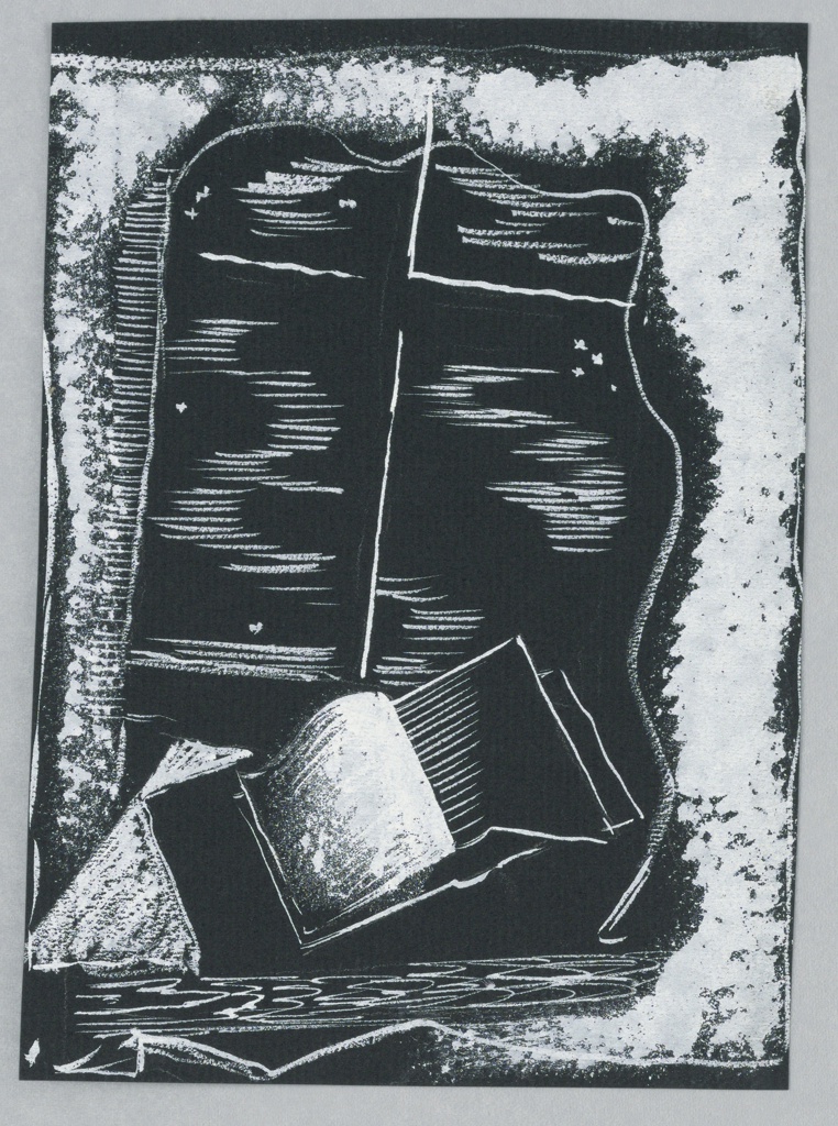 Drawing, Study of a Book by a Window; Designed by Edward McKnight Kauffer (American, active England, 1890–1954); USA; brush and white gouache on black paper; 17.3 × 12.4 cm (6 13/16 × 4 7/8 in.); Gift of Mrs. E. McKnight Kauffer; 1963-39-837