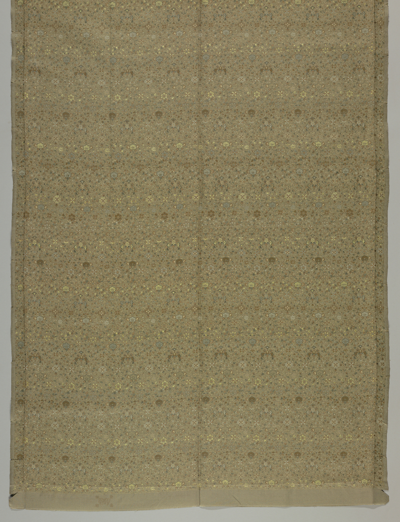 This is a Obi fabric. It is dated late 19th–early 20th century and we acquired it in 1964. Its medium is silk, metallic thread and its technique is twill weave with supplementary weft patterning (brocade). It is a part of the Textiles department.