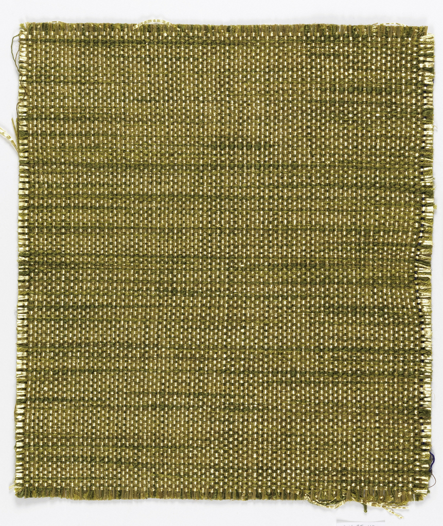 This is a Square. It was designed by Marjatta Metsovaara-Nystrom and woven by Marjatta Metsovaara-Nystrom. It is dated 1960–69 and we acquired it in 1964. Its medium is linen, rayon, viscose and its technique is plain weave. It is a part of the Textiles department.