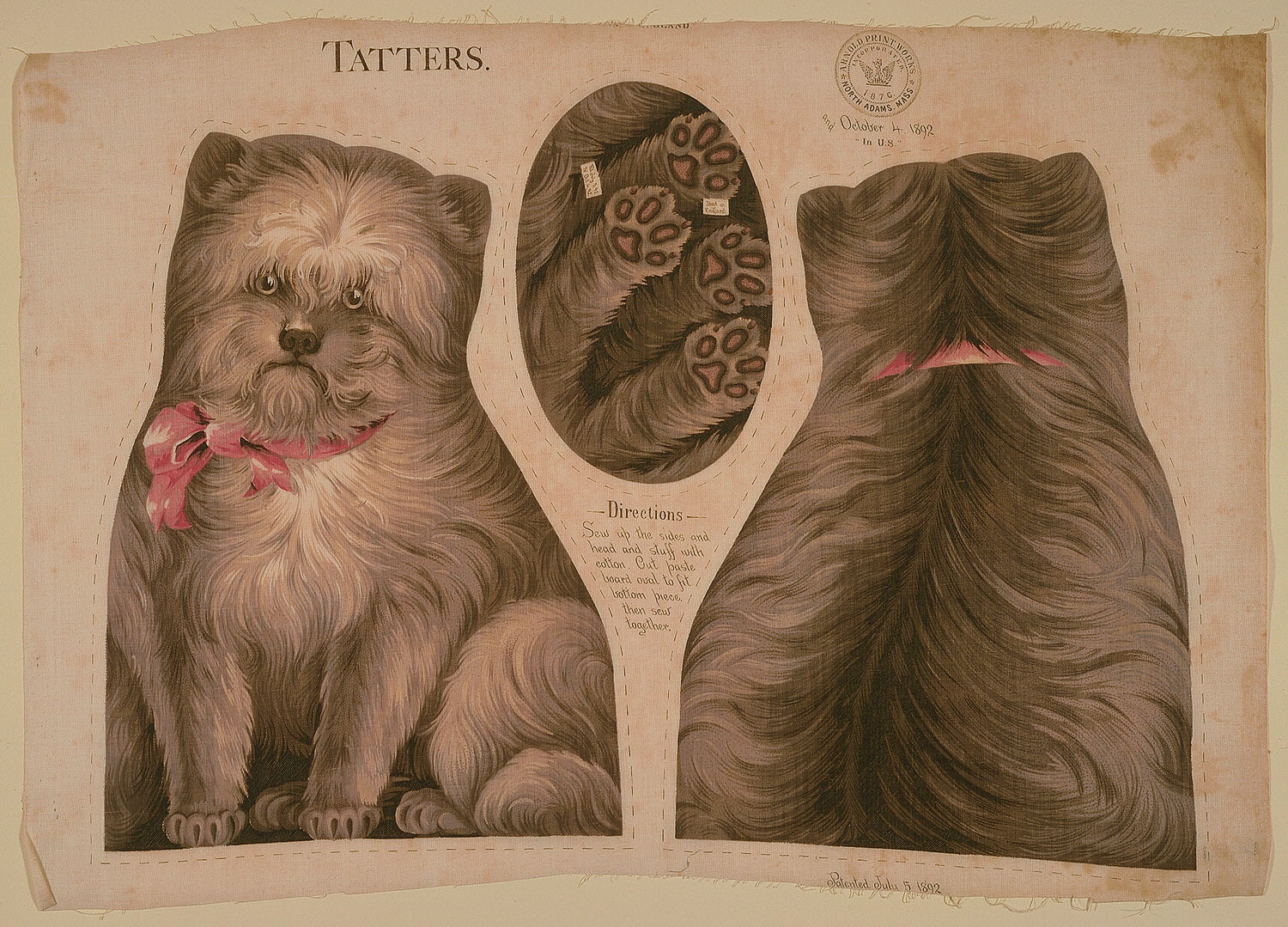 This is a Textile. It was printed by Arnold Print Works, N. Adams, Mass.. It is dated 1892 and we acquired it in 1964. Its medium is cotton and its technique is roller-printed on plain weave. It is a part of the Textiles department.