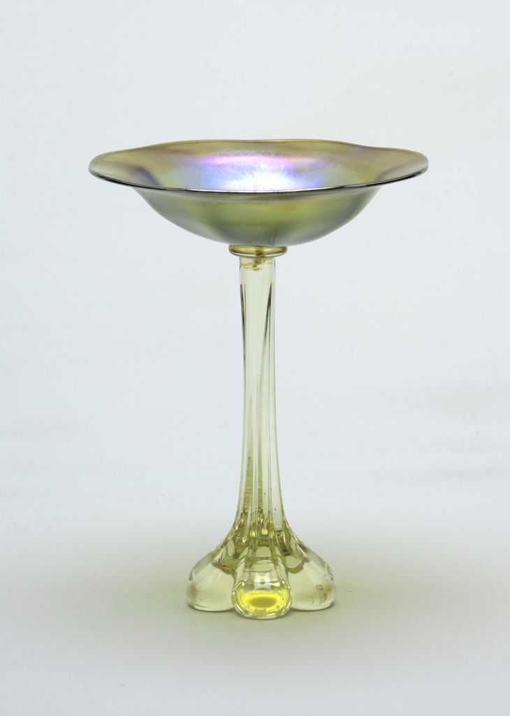 This is a Candy dish. It was made by Louis Comfort Tiffany. It is dated ca. 1900 and we acquired it in 1966. Its medium is favrile glass. It is a part of the Product Design and Decorative Arts department.