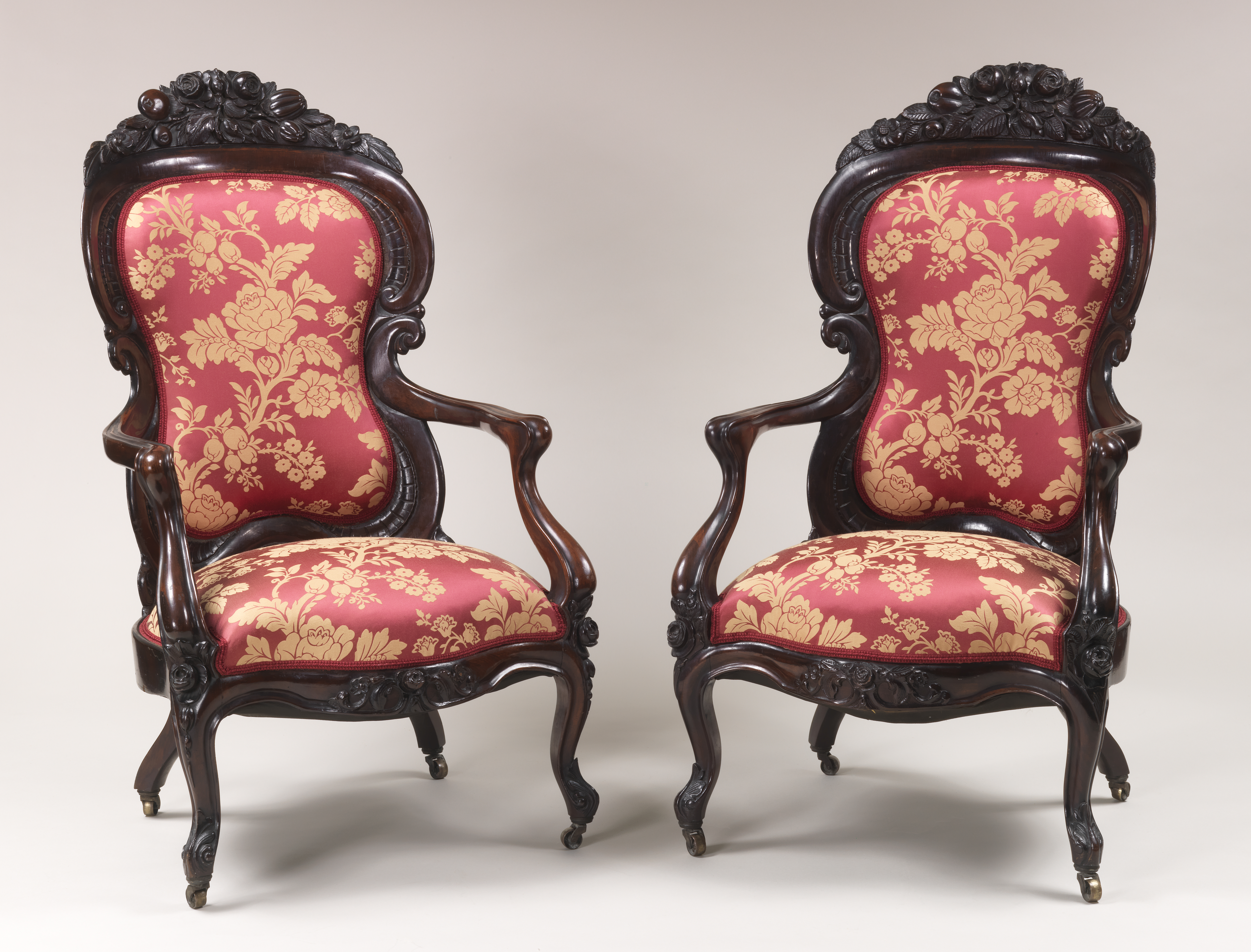 Pair of Armchairs Chairs; Attributed to John Henry Belter (American, b. Germany, 1804 – 1863); USA; laminated rosewood, cotton upholstery, metal; H x W x D (a): 109.5 x 79 x 62.8 cm (43 1/8 x 31 1/8 x 24 3/4 in.) H x W x D (b): 109.6 x 77 x 62.7 cm (43 1/8 x 30 5/16 x 24 11/16 in.); Gift in memory of Julia M. Halleran by her children; 1966-85-1-a,b