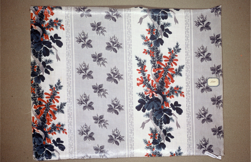 This is a Textile. It was manufactured by Schwartz-Huguenin. It is dated 1851–63 and we acquired it in 1967. Its medium is cotton and its technique is printed by engraved roller on plain weave. It is a part of the Textiles department.