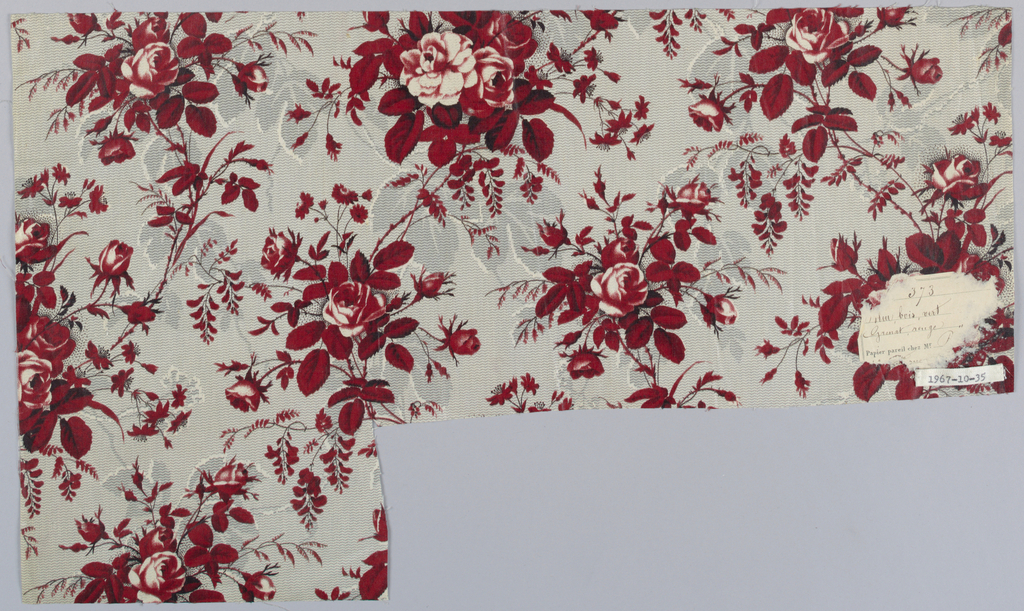 This is a Textile. It is dated 1851–63 and we acquired it in 1967. Its medium is cotton and its technique is printed by engraved roller and block printed; partially glazed. It is a part of the Textiles department.