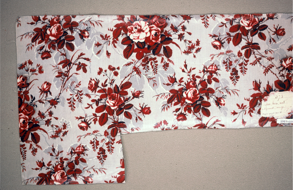 This is a Textile. It is dated 1851–63 and we acquired it in 1967. Its medium is cotton and its technique is printed by engraved roller and block printed; partially glazed. It is a part of the Textiles department.