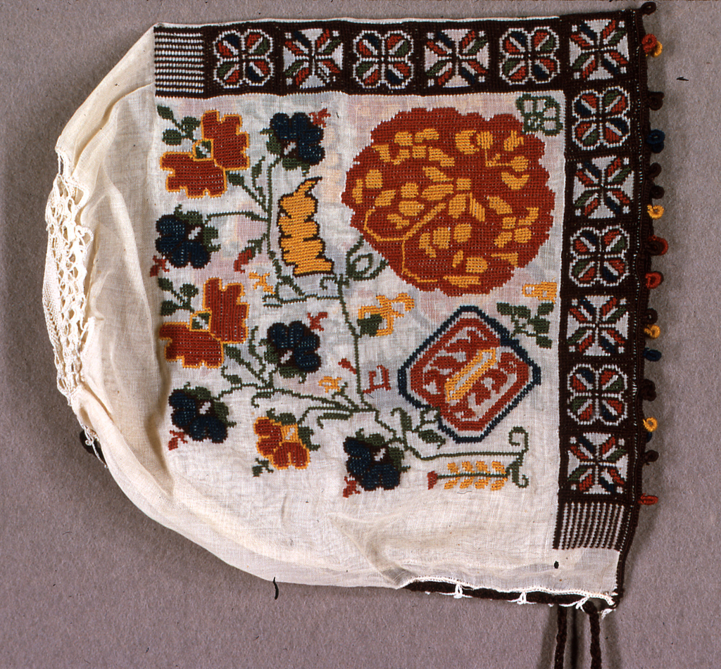 Hat (Greece); silk embroidery on linen foundation; H x W: 25 x 22 cm (9 13/16 x 8 11/16 in.); Gift of Mrs. Norris W. Harkness; 1967-17-1