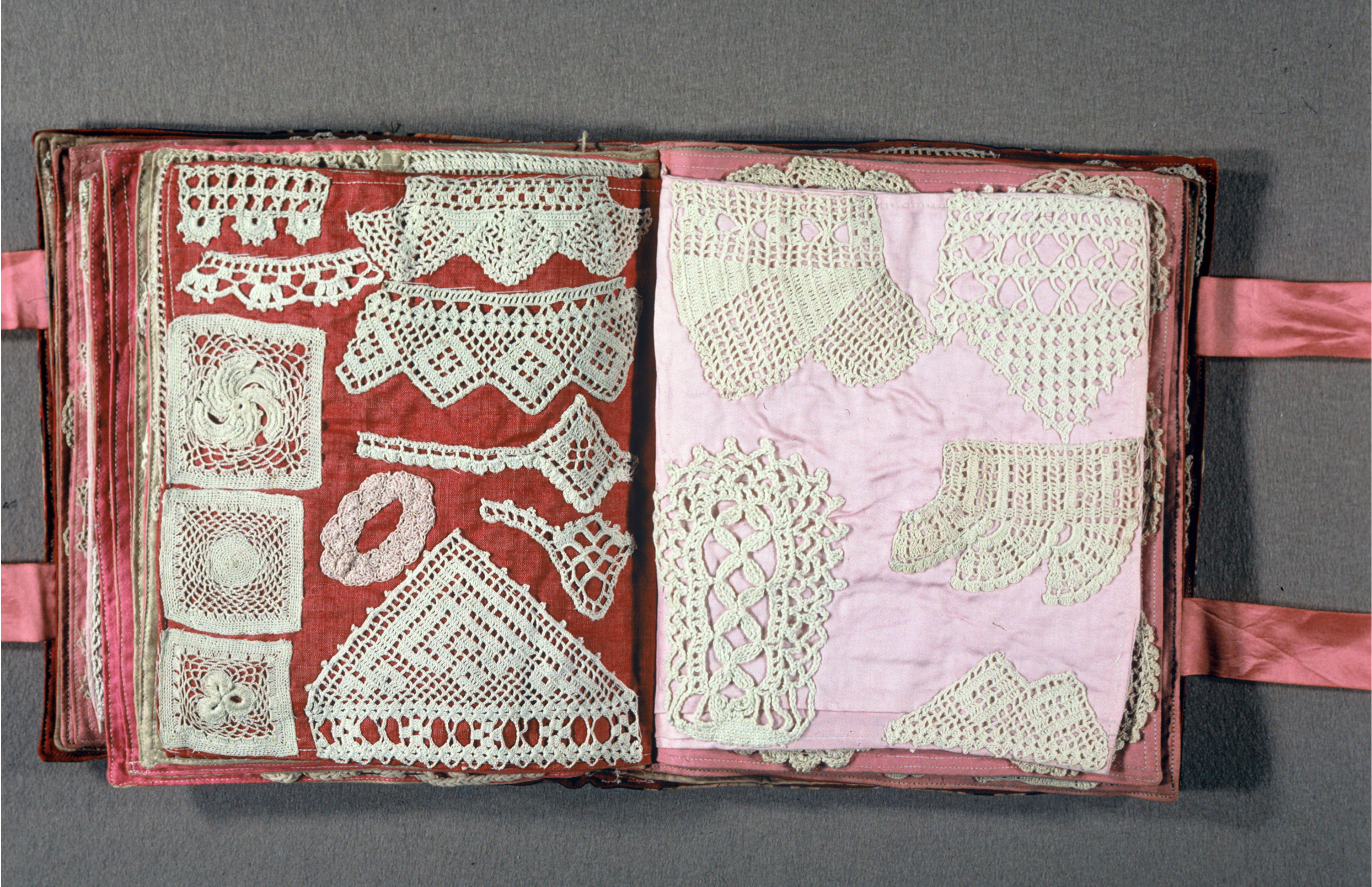 This is a Scrapbook of crochet samples. It is dated ca. 1850 and we acquired it in 1967. Its medium is cotton, silk, linen, wool and its technique is crochet. It is a part of the Textiles department.