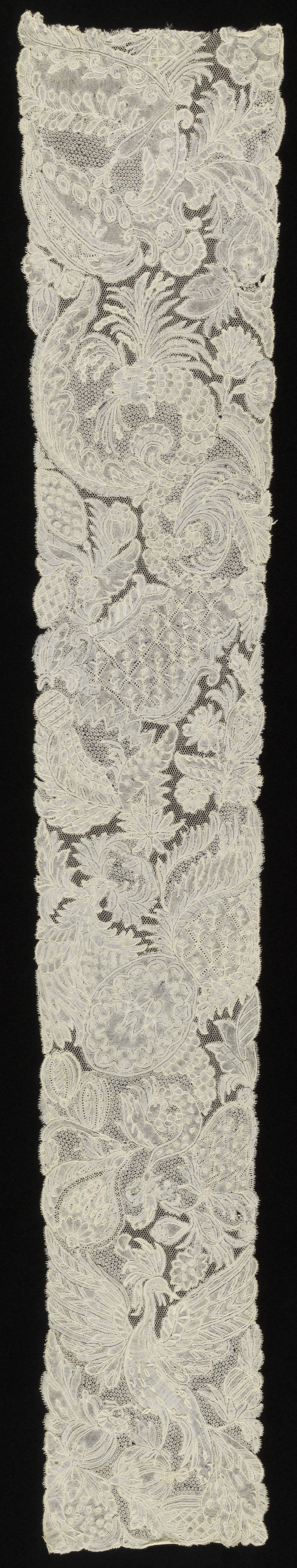 This is a Cap streamers. It is dated 1700–1750 and we acquired it in 1967. Its medium is linen and its technique is bobbin lace, brussels style. It is a part of the Textiles department.