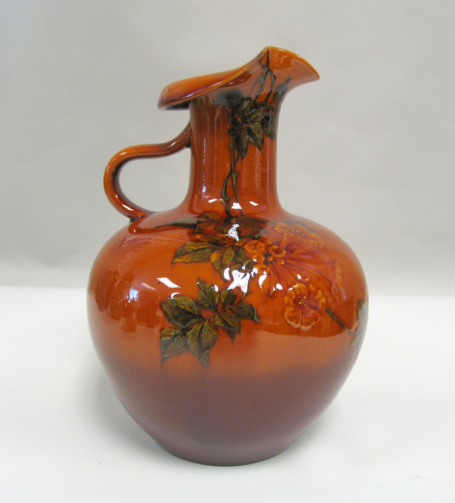 This is a ewer. It was manufactured by Rookwood Pottery and decorated by Albert R. Valentien. It is dated 1888 and we acquired it in 1967. Its medium is glazed earthenware. It is a part of the Product Design and Decorative Arts department.