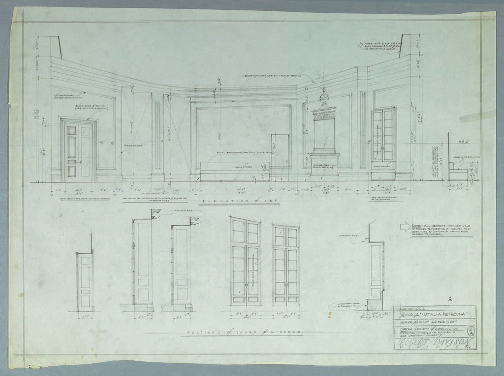 Drawing, Set design: Natalya Petrovna: Elevation of Set and Section of doors and windows; Robert Davison; USA; 1967-60-3