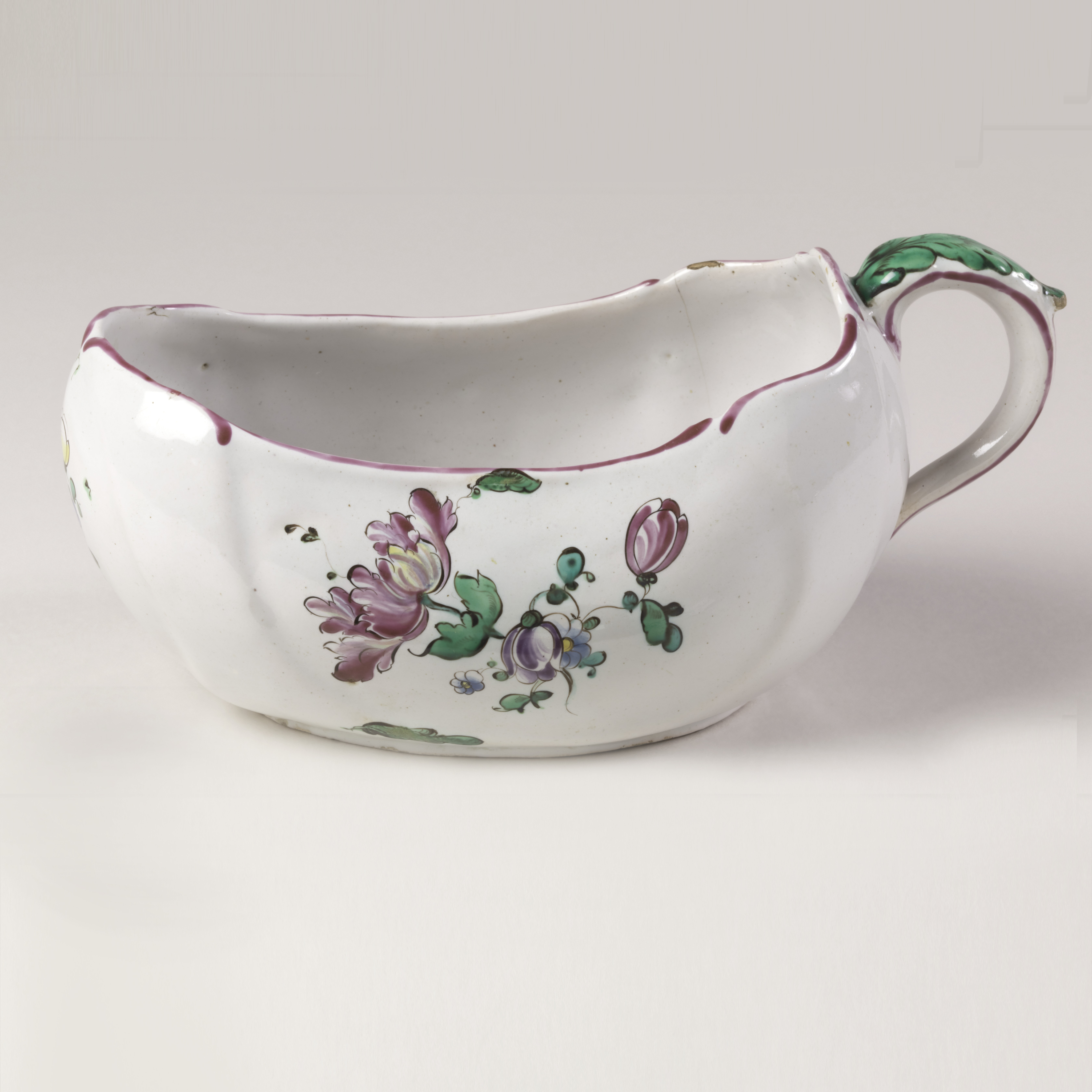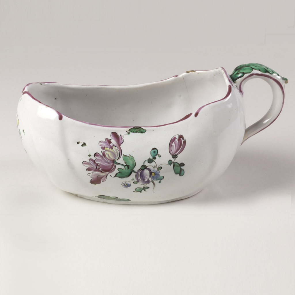 This is a Bourdalou. It was manufactured by Aprey Pottery Factory. It is dated ca. 1775 and we acquired it in 1967. Its medium is tin-glazed earthenware. It is a part of the Product Design and Decorative Arts department.