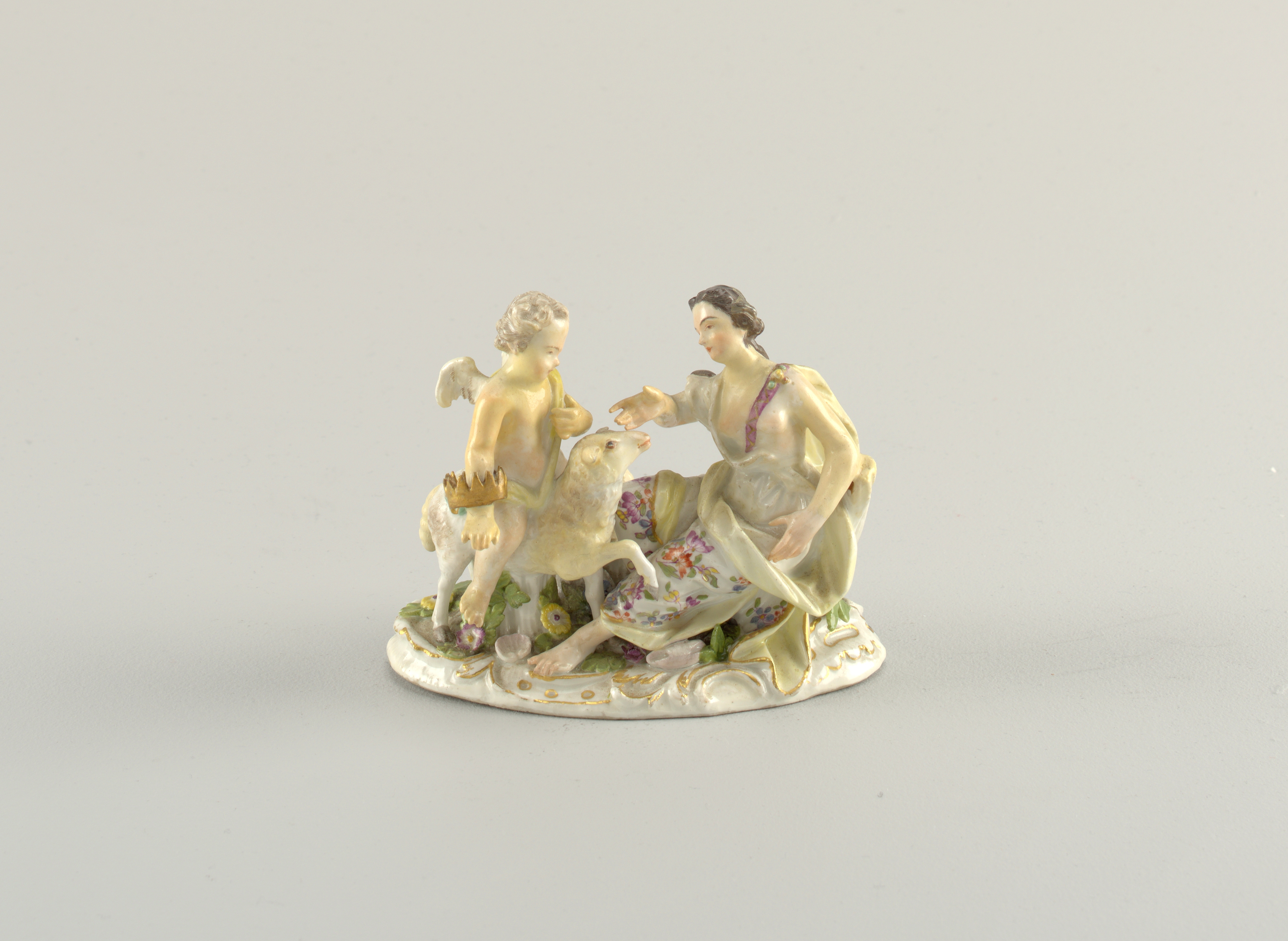 Figural Group of a Cherub and a Seated Lady Figure; Manufactured by Meissen Porcelain Manufactory (Germany); hard paste porcelain, vitreous enamel, gold; H x W x D: 10.5 × 13 × 9 cm (4 1/8 × 5 1/8 × 3 9/16 in.); Gift of Paul Manheim; 1967-92-13