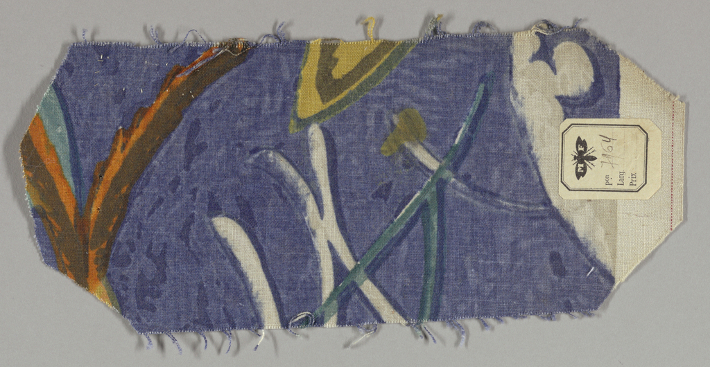 Black "L" stamped on back Register marks in selvage; single red thread woven at each selvage Original tag: M.F./ETOFFES POUR AMEUBLEMENTS/ Impressions. Nouvelles/ Toiles de Jouy et Velours/ Dessin 7964