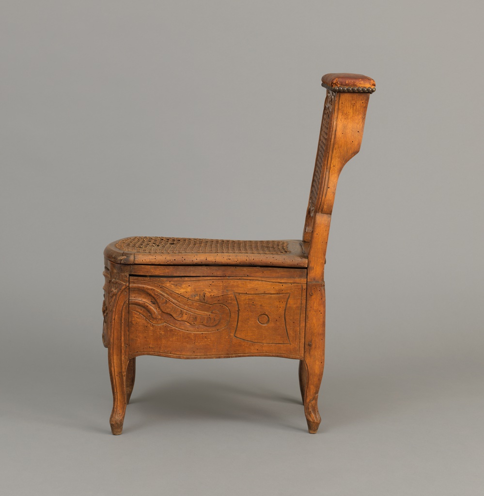 Practicality was not overlooked in the development of specialized seat furniture in mid-eighteenth-century France. This chaise bidet à nécessaires was designed to be straddled; the leather-covered top of the caned chairback serves as an armrest; and hinges open compartments for toiletries.
