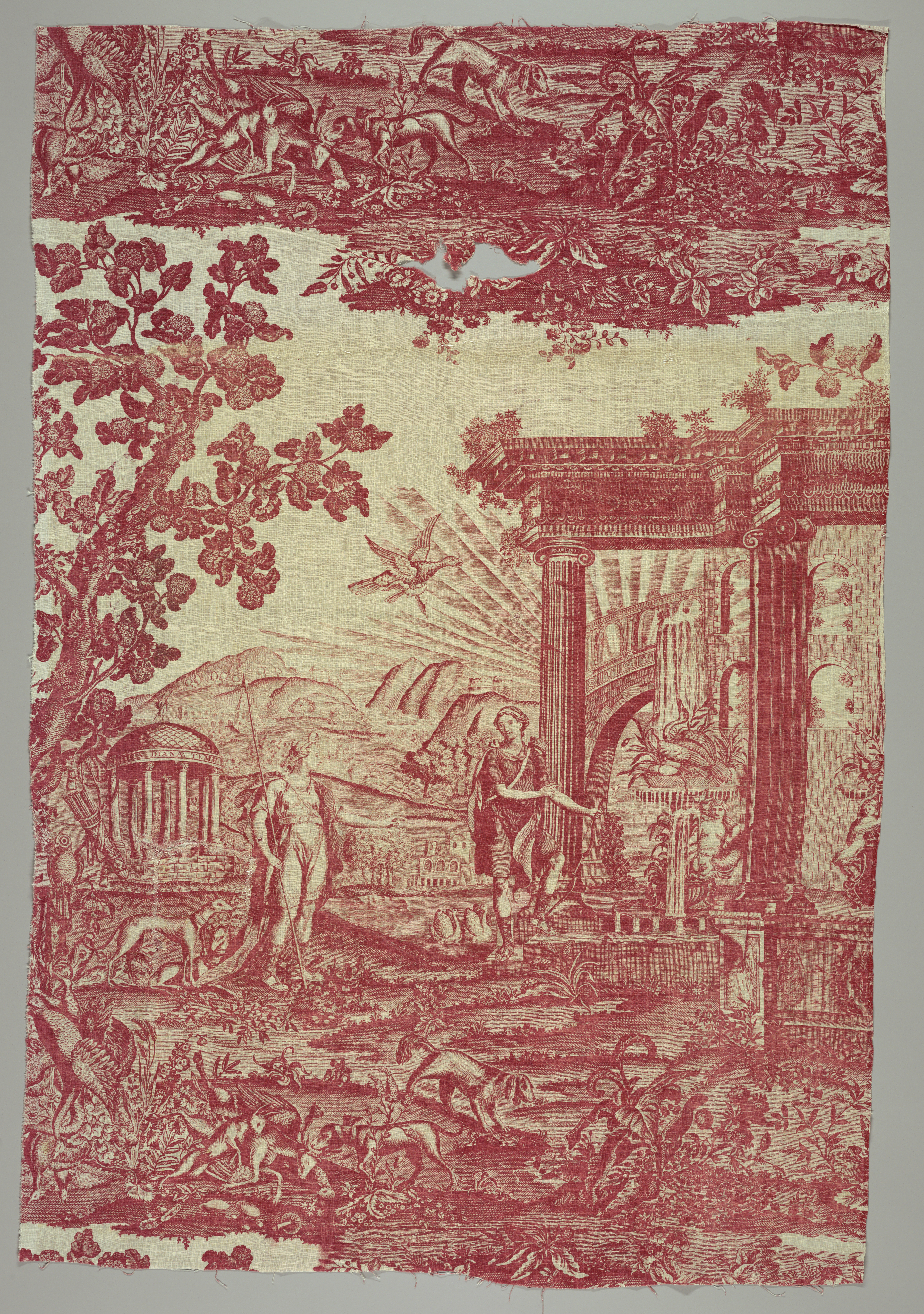 This is a Textile. It was printed by Bromley Hall. It is dated ca. 1790 and we acquired it in 1968. Its medium is cotton and its technique is copperplate printed. It is a part of the Textiles department.