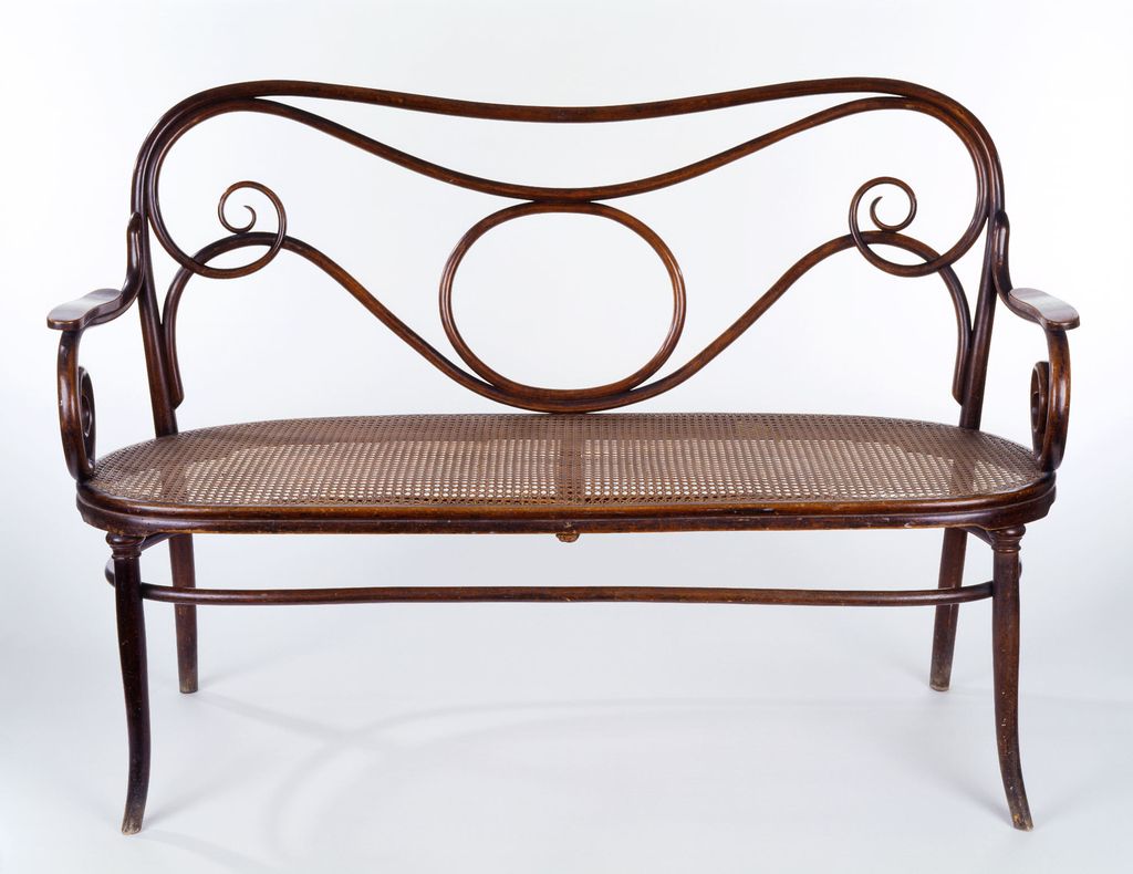 In 1853, Viennese cabinetmaker Michael Thonet founded Thonet Brothers (named for his five sons), and directed the firm until his death in 1871. In that time, Thonet created some of the most successful chair designs of the last two centuries. In the 1830s, he experimented with using heat and steam to bend sheets of laminated wood and was mass-producing chairs by 1849. Bending solid wood, whose outer fibers stretched to the point of breaking, proved more difficult, but he perfected the process by 1859. He clamped sheets of steel to the outside edge of a piece of straight wood, steamed it and bent it, then dried it in a heated room with the metal still attached. The steel created a uniform compression, preventing the fibers from stretching. Beechwood, easily accessible and inexpensive, was ideal for its straight fibers and few knots. Although his chairs are more well-known today, Bench No. 8 shows the variety Thonet achieved by taking additional steps to bend the wood in multiple directions. In each piece, the form itself is the decoration, a quality that later inspired early twentieth-century modernists.