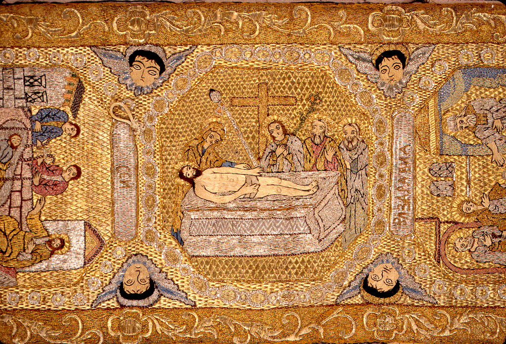 Hanging; silk and metal-wrapped silk embroidery on cotton; several kinds of metallic thread used; H x W: 261 x 28 cm (8 ft. 6 3/4 in. x 11 in.); Gift of Alan L. Wolfe; 1969-50-28