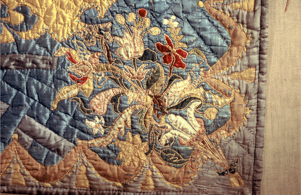 This is a panel. It is dated 18th century and we acquired it in 1969. Its medium is silk, wool, linen and its technique is silk applique, embroidered and quilted (stuffed with wool). It is a part of the Textiles department.