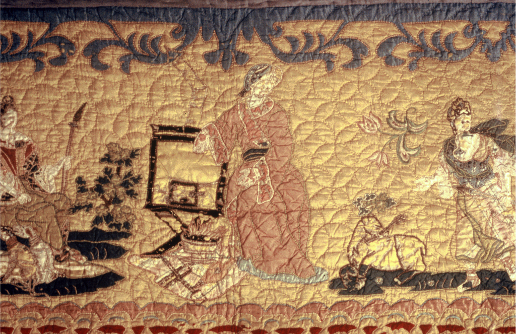 This is a panel. It is dated 18th century and we acquired it in 1969. Its medium is silk, wool, linen and its technique is silk applique, embroidered and quilted (stuffed with wool). It is a part of the Textiles department.