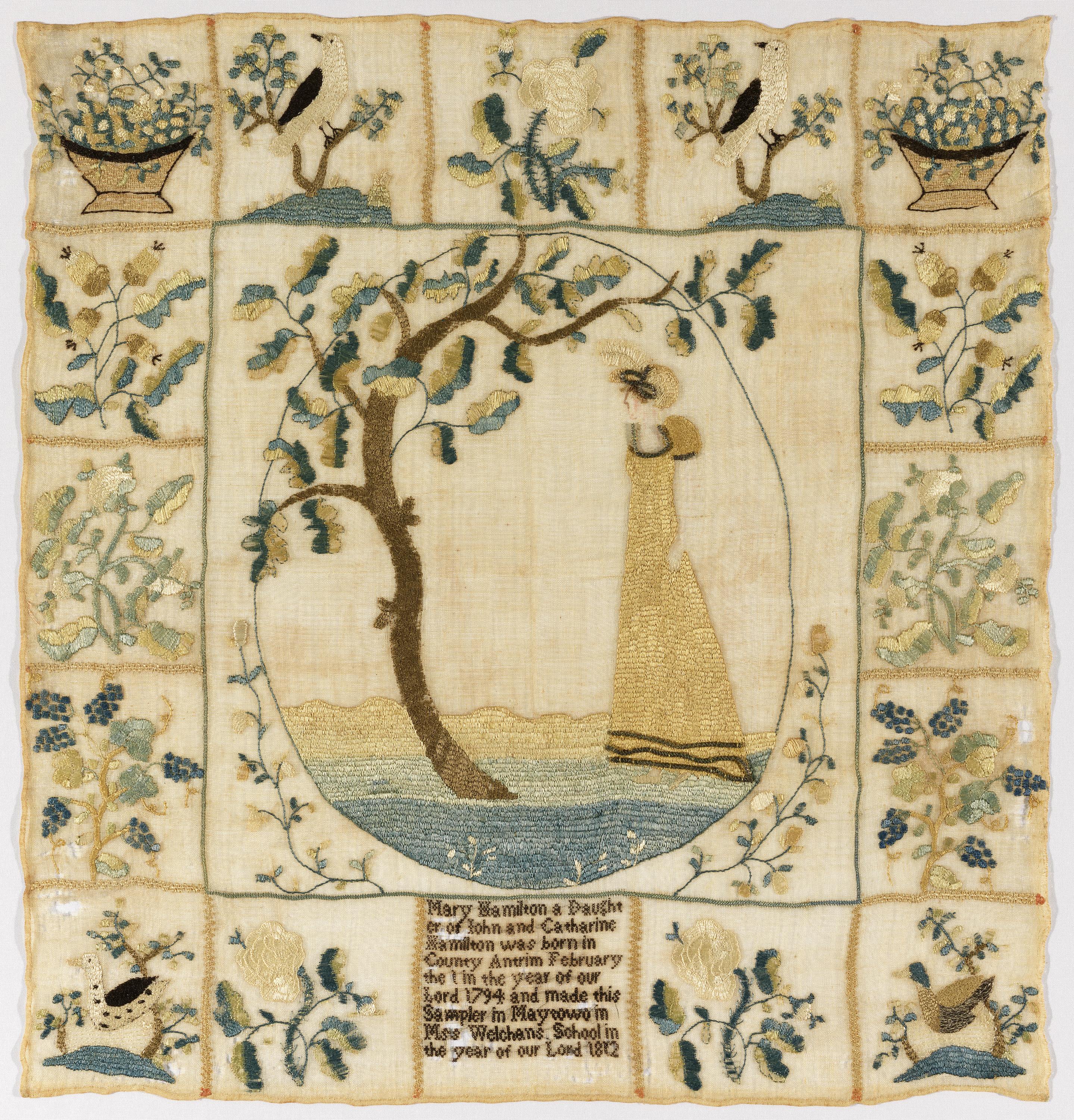 Mary Hamilton a Daughter of John and Catherine Hamilton was born in County Antrim February the 1 in the year of our Lord 1794 and made this Sampler in Maytown in Miss Welchens School in the year of our Lord 1812
