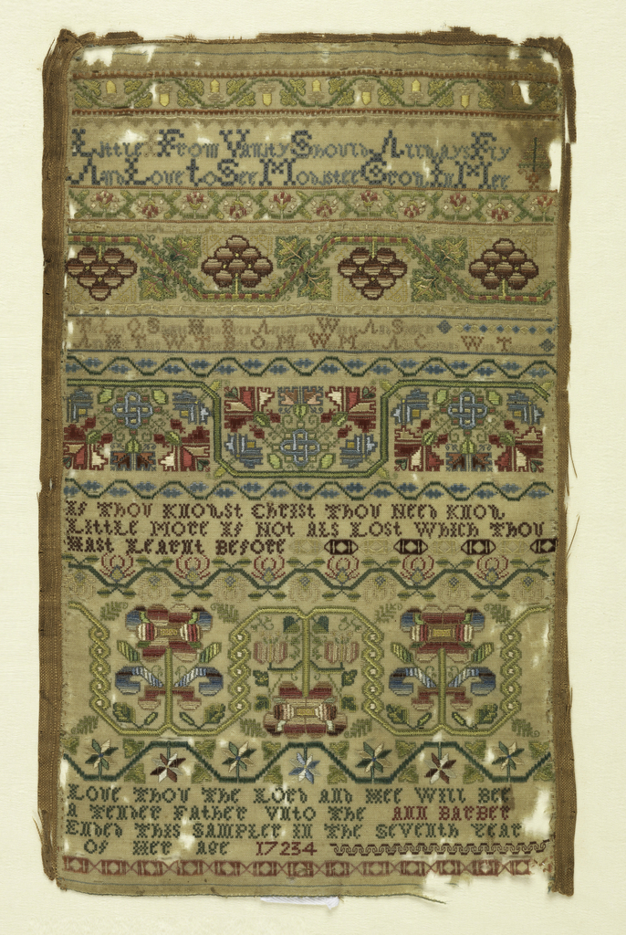 This is a Sampler. It is dated 18th century and we acquired it in 1971. Its medium is silk on linen and its technique is embroidered. It is a part of the Textiles department.
