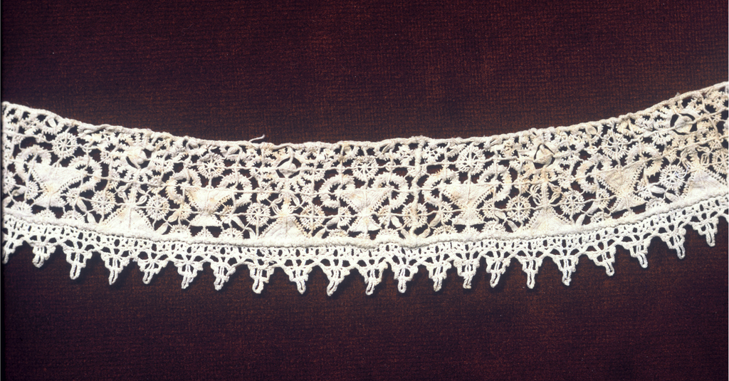 This is a Band. It is dated 16th–17th century and we acquired it in 1971. Its medium is natural linen and its technique is grid of laid cords with needle lace, reticella style and edge of bobbin lace, continuous braid-like. It is a part of the Textiles department.