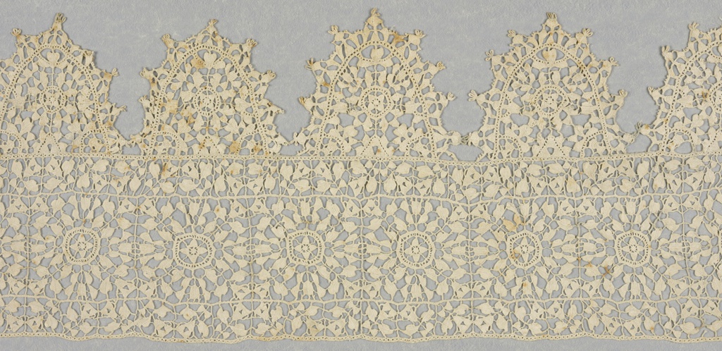 This is a Band. It is dated 17th century and we acquired it in 1971. Its medium is linen and its technique is grid of laid cords with needle lace, reticella style; edge of punto in aria. It is a part of the Textiles department.