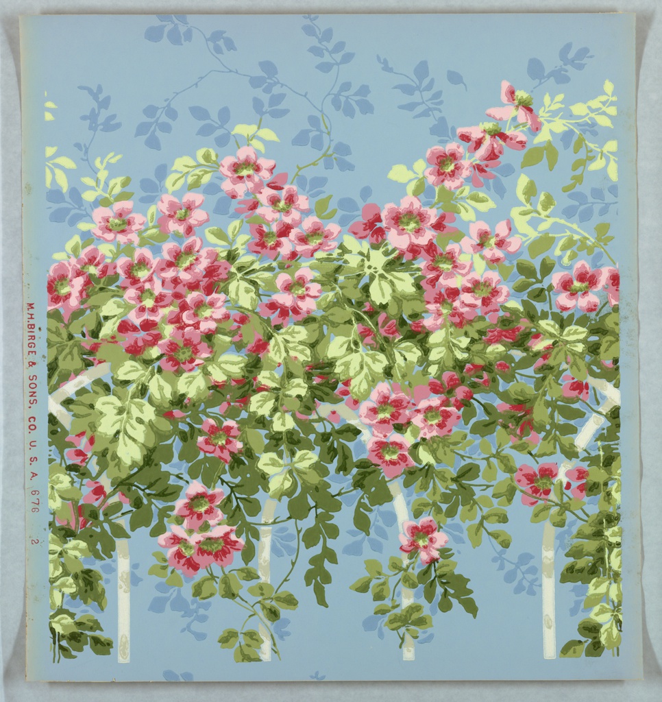 Author Gertrude Crownfield (American, 1867–1945), Crownfield’s younger sister, took great pains to safeguard her sister’s legacy after her death in 1929. Sophia Crownfield didn’t patent any of her designs for M. H. Birge & Sons, and the company never acknowledged her as one of their designers. On her gouache design of forsythia branches on a trellis, Gertrude added the text “Used by Birge Co.” The Birge wallpaper frieze to the right shows how a Crownfield design might have appeared in its finished form.