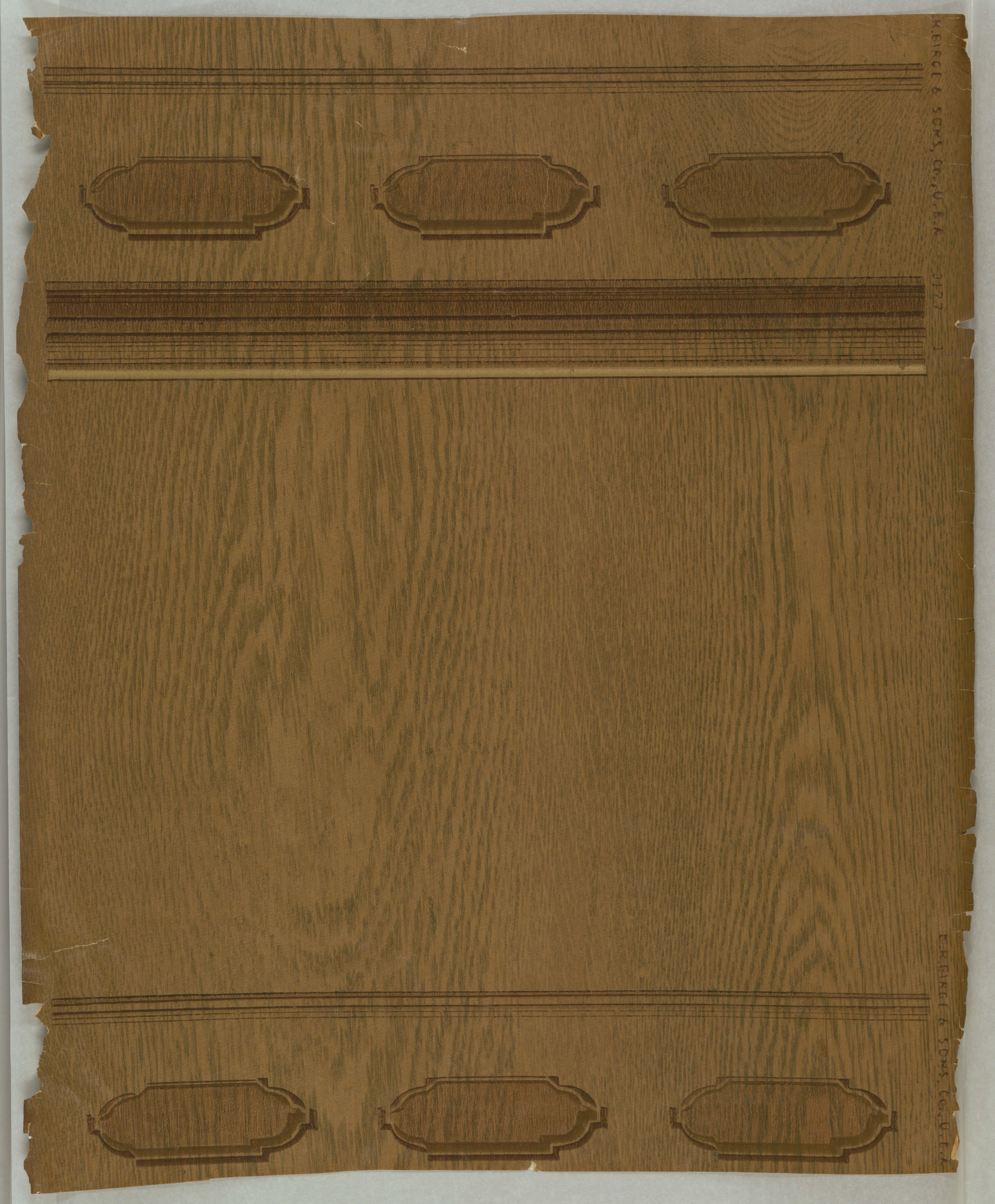 This is another odd little wallpaper that intrigued me for a long time. It is just a small fragment showing a wood molding and inset panel with gilt bronze mounts. My first thought is that it was a dado panel and would run horizontally along the bottom of the wall, between the chair rail and baseboard moldings. This made sense given the trend for Mission and Colonial Revival interiors popular at the time. So I was pleasantly surprised when I came across the following illustration in “Wallpaper and Wallcoverings” by A.S. Jennings, 1903, showing this wallpaper in situ. The paper forms part of a wide wainscot with a separate Dutch-inspired wallpaper installed above. This type of wall treatment, with its very masculine nature, would be appropriate for an entry, hallway or library, though it would also work in a dining room.