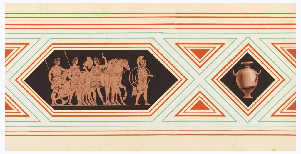 This is a Decorative panel. It was created by M. Victor Poterlet and printed by Jules Desfossé and manufactured by Dauptain. It is dated ca. 1840 and we acquired it in 1972. Its medium is block-printed paper. It is a part of the Wallcoverings department.