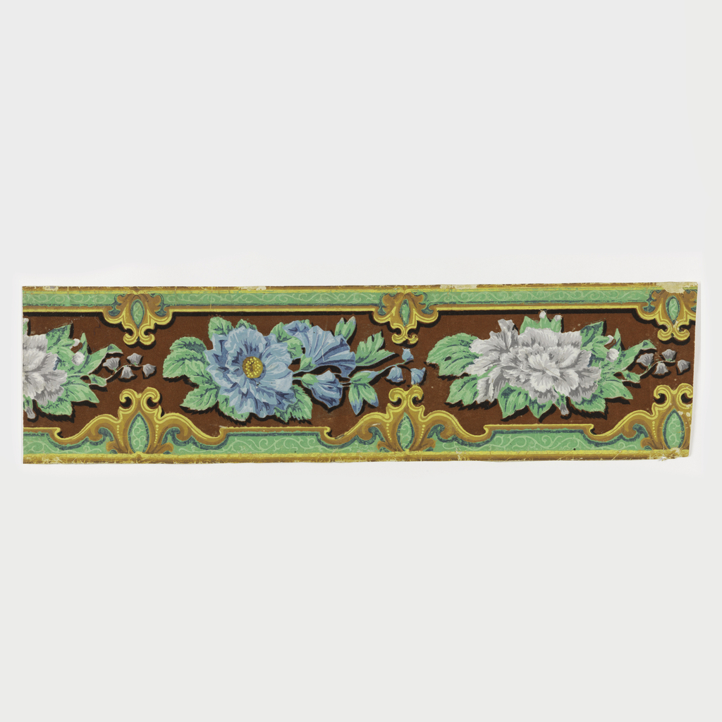 This is a Border. It is dated 1835–45 and we acquired it in 1972. Its medium is block-printed and flocked on handmade paper. It is a part of the Wallcoverings department.