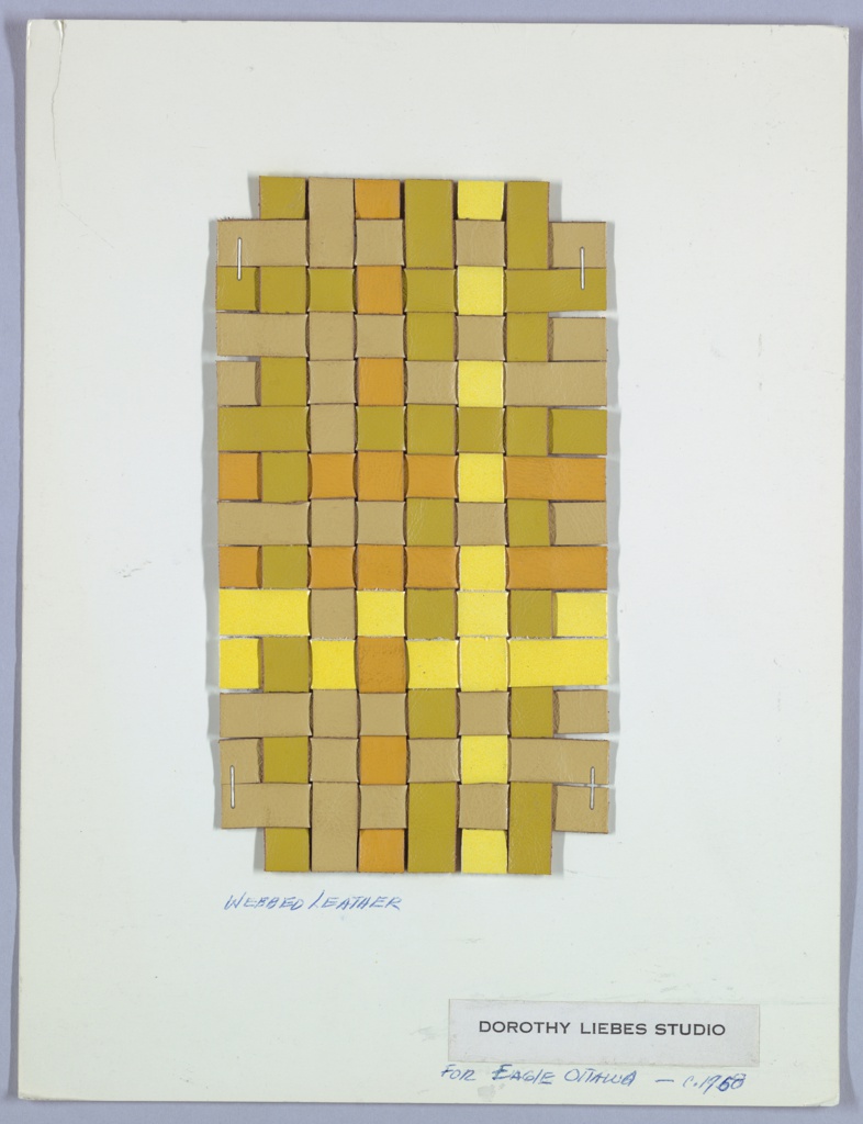 This is a Sample card. It was designed by Dorothy Wright Liebes and woven by Dorothy Wright Liebes. It is dated 1958 and we acquired it in 1972. Its medium is leather and its technique is plain weave. It is a part of the Textiles department.
