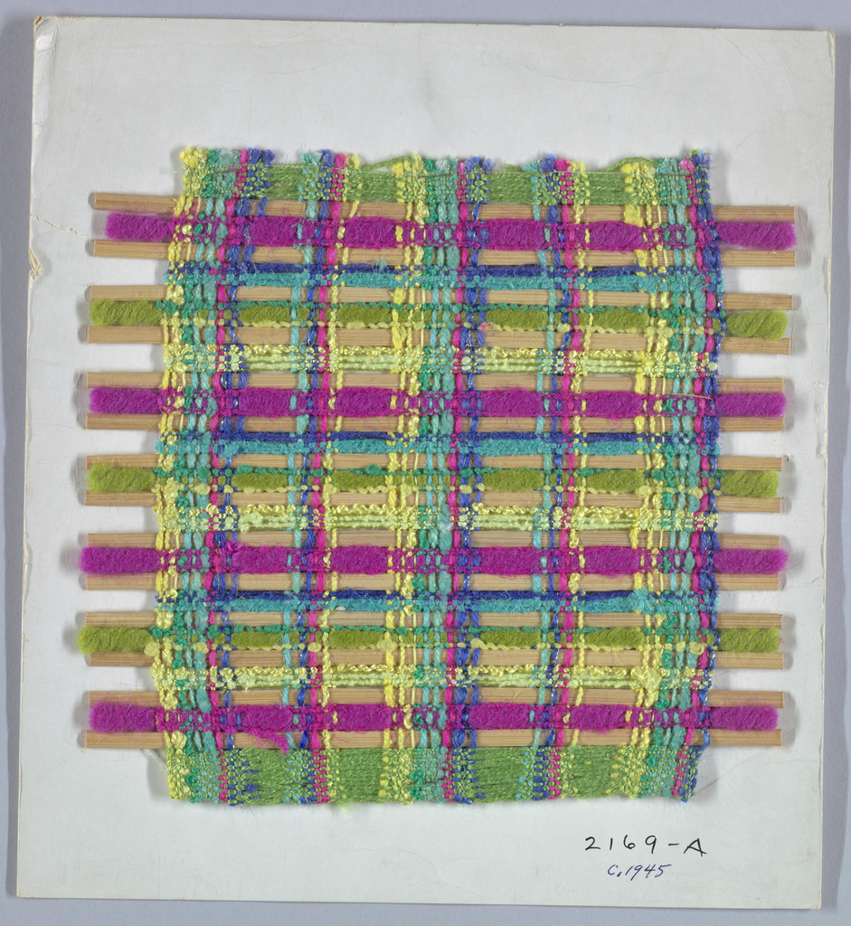 This is a Sample card. It was designed by Dorothy Wright Liebes and woven by Dorothy Wright Liebes. It is dated 1945 and we acquired it in 1972. Its medium is cotton, viscose rayon, silk, wool, cellulose acetate butyrate-laminated aluminum yarn, reed and its technique is plain weave. It is a part of the Textiles department.