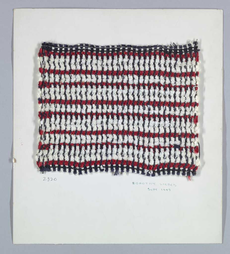This is a Sample card. It was designed by Dorothy Wright Liebes and woven by Dorothy Wright Liebes. It is dated September 1947 and we acquired it in 1972. Its medium is cotton, viscose rayon and its technique is 2/2 twill woven. It is a part of the Textiles department.