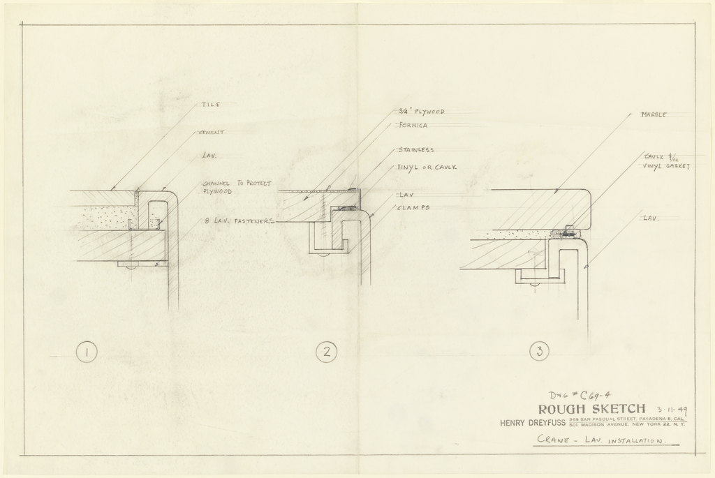 Inscribed in graphite, left center: TILE / CEMENT / LAV. / CHANNEL TO PROTECT / PLYWOOD / 8 LAV. FASTNERS / 1; center: ¾” PLYWOOD / FORMICA / STAINLESS / VINYL OR CAVLK / LAV / CLAMPS / 2; right center: MARBLE / CAVLK &/OR / VINYL GASKET / LAV. / 3; lower right: DW6 #C69-4 / 3-11-49 / CRANE - LAV. INSTALLATION.