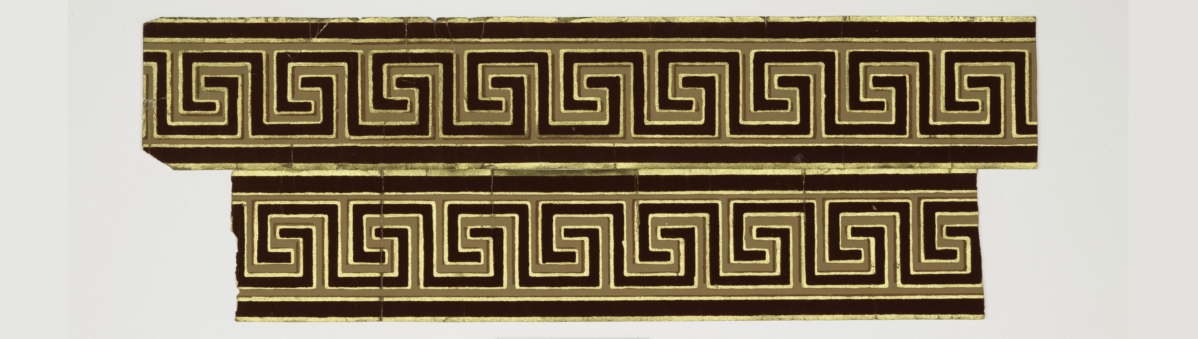 This is a Border. It is dated 1850–70 and we acquired it in 1973. Its medium is block-printed and flocked paper. It is a part of the Wallcoverings department.