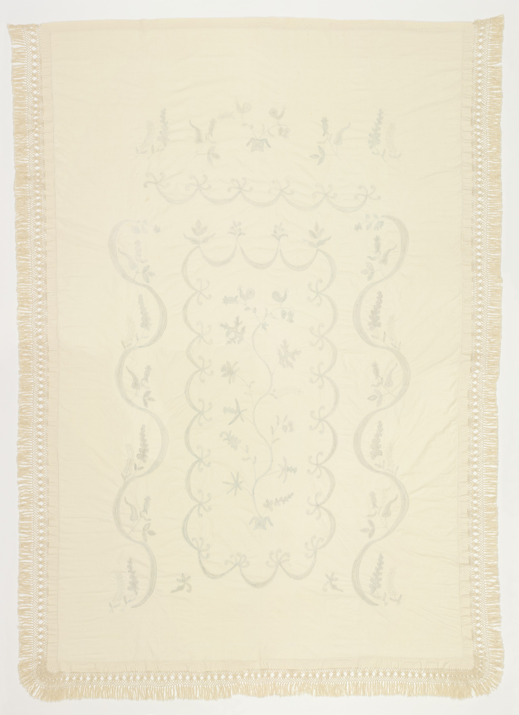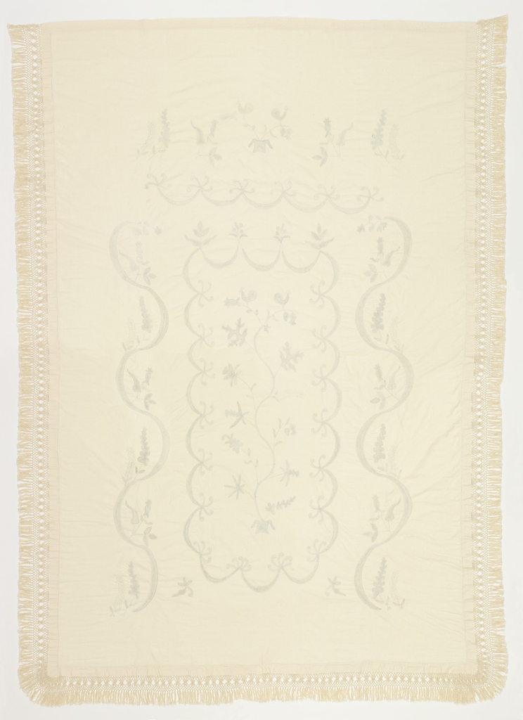 This is a Bedcover. It is dated early 19th century and we acquired it in 1973. Its medium is cotton and its technique is embroidered on plain weave. It is a part of the Textiles department.