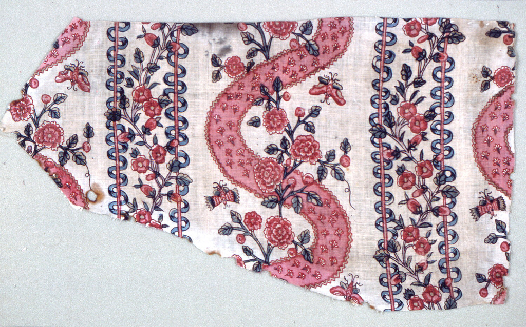 This is a Chintz fragment. It is dated 1750–1800 and we acquired it in 1973. Its medium is cotton and its technique is mordants for 2 reds, brown and black applied by pen and brush; madder dyed; blue applied over resist; yellow applied by brush; chintz on plain weave. It is a part of the Textiles department.