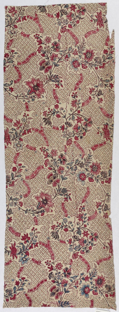 This is a Chintz fragment. It is dated 1750–1800 and we acquired it in 1973. Its medium is cotton and its technique is block-printed for outlines and imbricated background with mordant painted over resist for fillings (chintz) on plain weave. It is a part of the Textiles department.