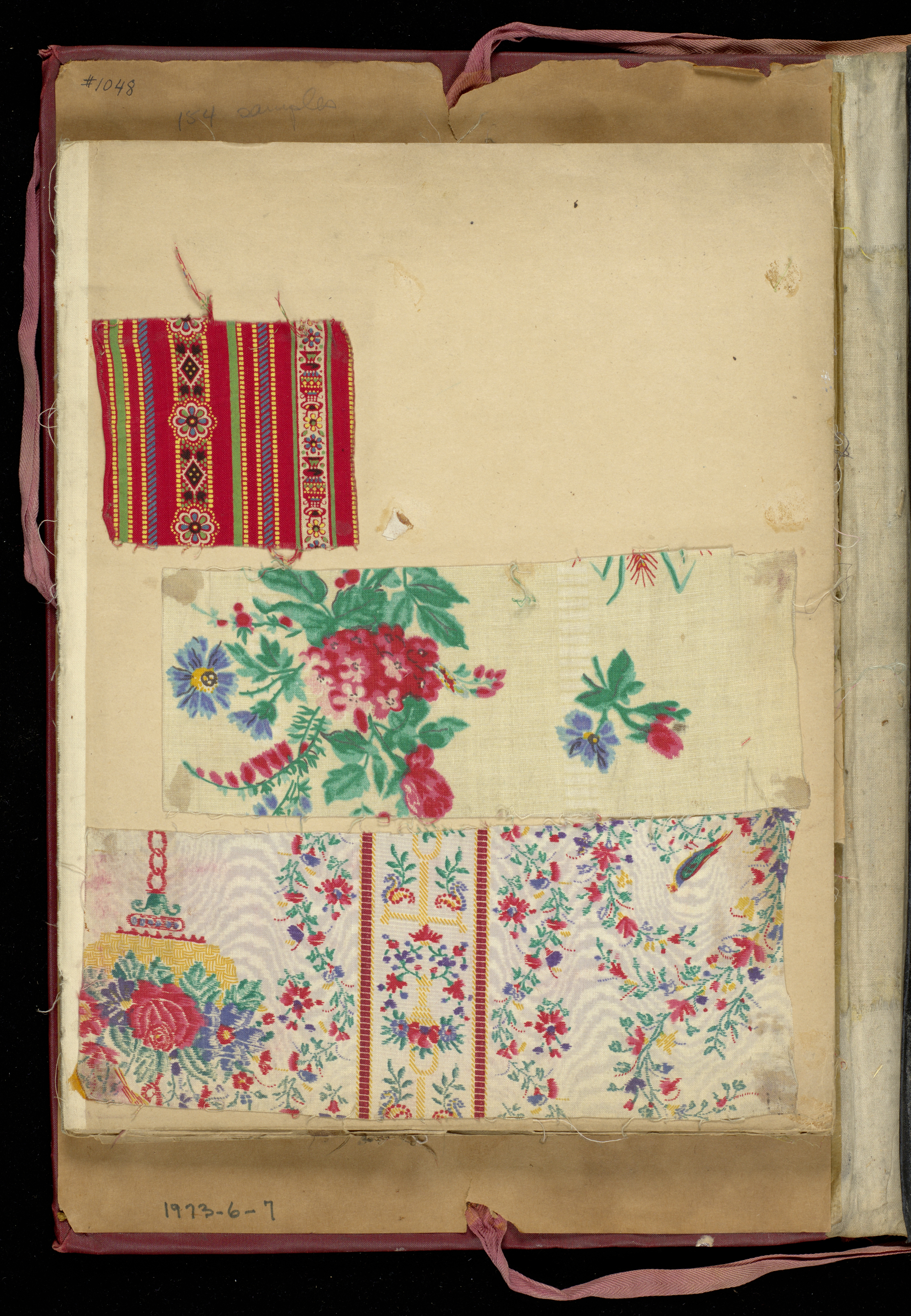This is a Scrapbook of textile swatches. It is dated 1850–1870 and we acquired it in 1973. Its medium is cotton and its technique is printed. It is a part of the Textiles department.