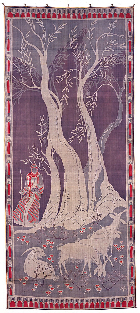 Batik, or resist-dye, is an ancient craft often associated with Indonesia, but practiced in regions throughout Africa and Asia. It became popular in United States in the 1910s and 20s, with artists such as Arthur Crisp, Pieter Mijer, and Lydia Bush-Brown attracting national attention. These artists worked in the traditional manner, painting paraffin and beeswax on their cloth to create a resist, but expanded the traditional design vocabulary to include patterns inspired by contemporary design and painterly subjects such as landscapes and still lifes. Bush-Brown, the daughter of artists Henry Kirke Brown and Margaret Lesley, is best known for her resist-dye illustrations of landscapes inspired by her travels in Mexico, Greece, Egypt, the Middle East, and other regions. This piece, a pastoral landscape with a large olive tree flanked by a shepherd and grazing goats, was inspired by her travels in Syria. The border pattern is clearly inspired by the pointed arches characteristic of Islamic architecture.