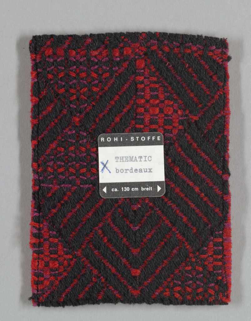 This is a Samples. It was manufactured by Rohi. It is dated 1973 and we acquired it in 1974. Its medium is wool and its technique is woven. It is a part of the Textiles department.