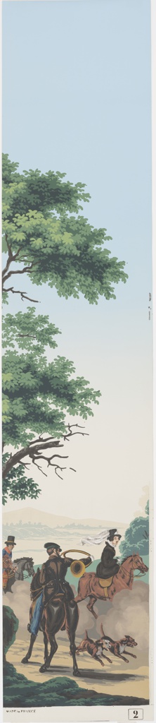 Scenic, Le Paysage a Chasses; Manufactured by Zuber & Cie (France); France; block printed on machine-made paper; L x W: 228 × 50 cm (7 ft. 5 3/4 in. × 19 11/16 in.); Gift of A.L. Diament & Co.; 1974-40-1-1/32