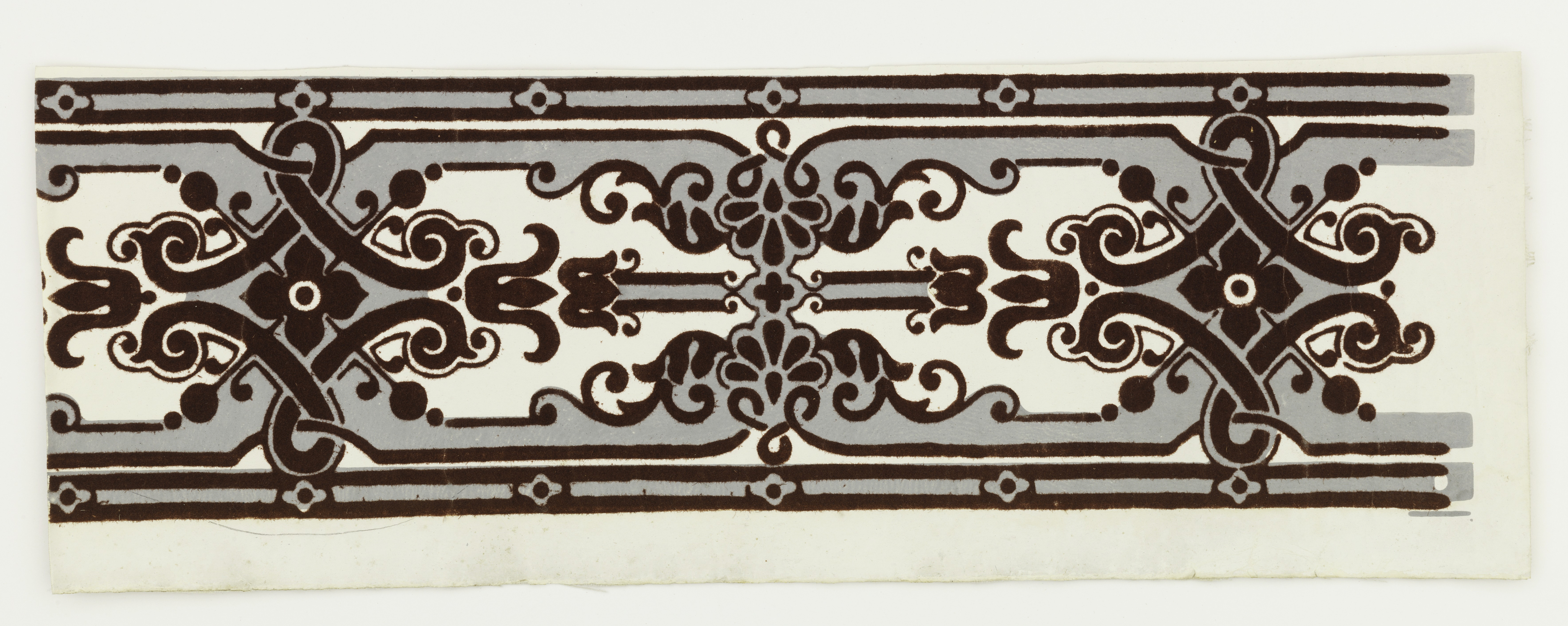 This is a Border. It is dated 1850–75 and we acquired it in 1974. Its medium is block-printed and flocked paper. It is a part of the Wallcoverings department.