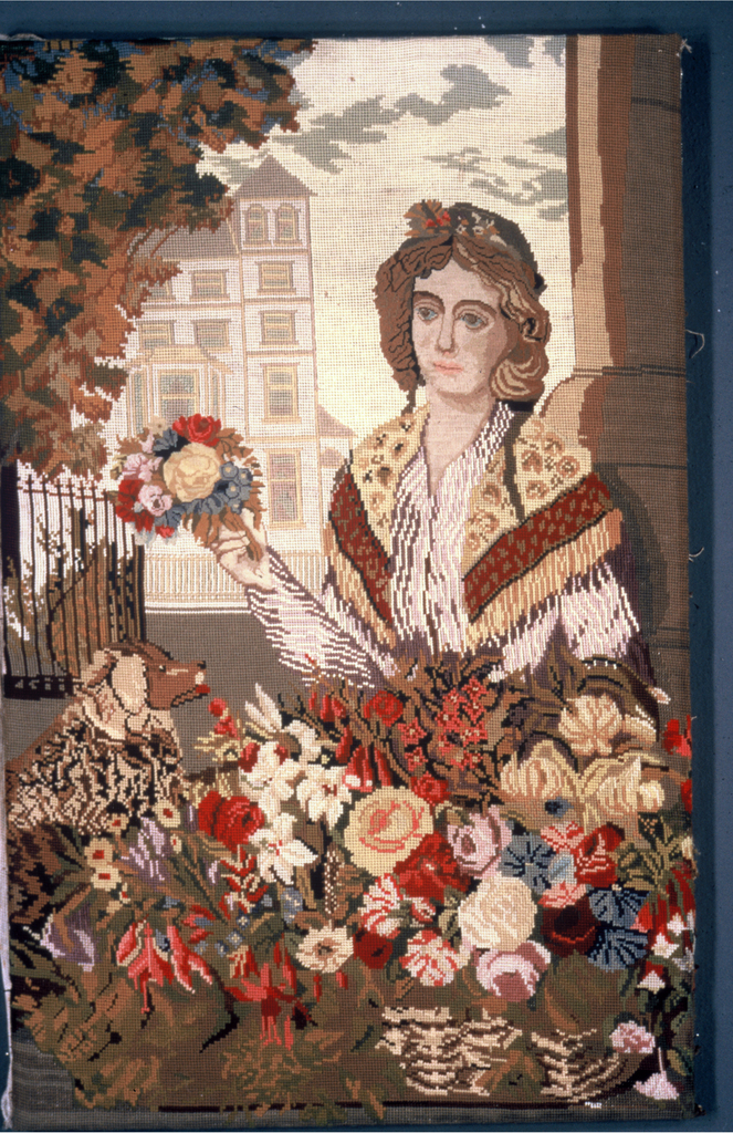 This is a Embroidered picture. It is dated mid-19th century and we acquired it in 1974. Its medium is cotton, wool, silk and its technique is counted stitch embroidery on plain weave. It is a part of the Textiles department.